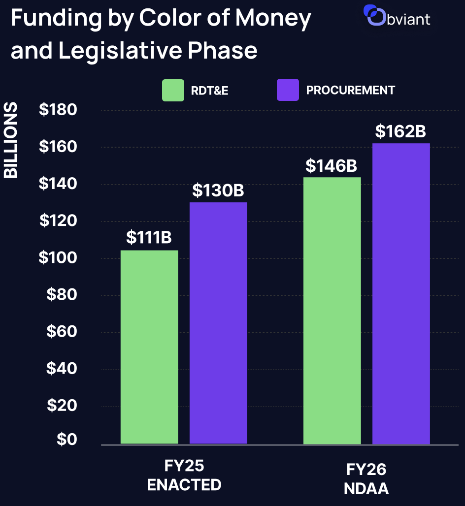 - While Procurement and MILCON also gained in the FY26 NDAA, RDT&E is the biggest winner.
